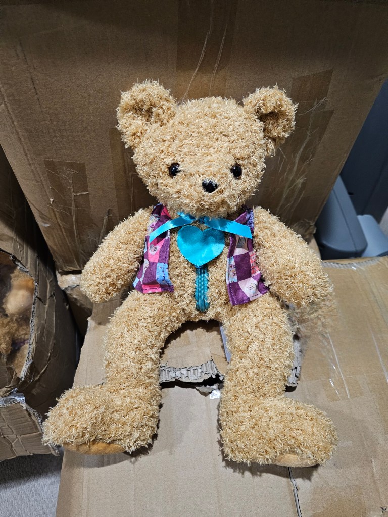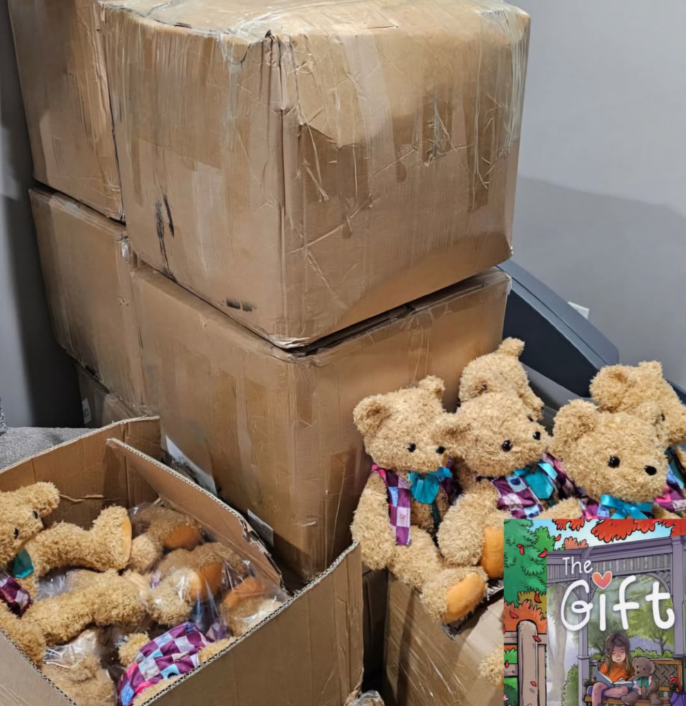 Patch Bear had a big day—his very first adventure! Boxes of Patch Bears arrived on my doorstep, each one waiting to find a special home. After carefully inspecting them, I chose my Patch Bear and filled him with hearts I had collected from family, friends, and even kind-hearted strangers. Then, it was time for his first photoshoot—just Patch, The Gift book, and the hearts that make him so special.